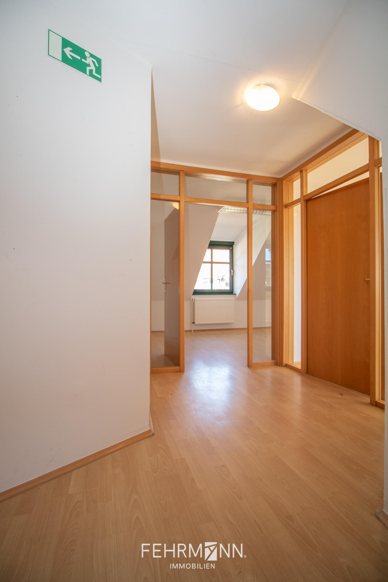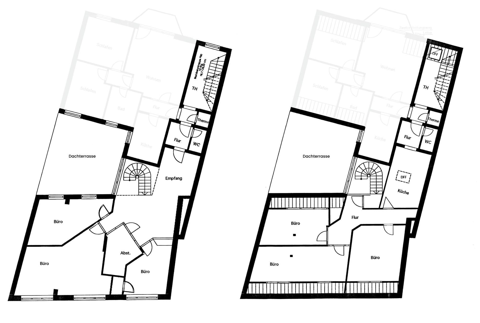 Diese modernen Büroflächen bieten eine ideale Arbeitsumgebung mit einer durchdachten Raumaufteilung über zwei Etagen. Das Obergeschoss umfasst einen großzügigen Empfangsbereich, mehrere helle Büroräume sowie ein WC. Eine besondere Zusatzfläche in Form einer Dachterrasse lädt zu Pausen oder Meetings im Freien ein.Im Dachgeschoss stehen weitere Büroräume, eine geräumige Küche sowie zusätzliche Flurbereiche und ein weiteres WC zur Verfügung. Die gepflegte Ausstattung schafft eine angenehme Arbeitsatmosphäre, während die funktionale Raumgestaltung flexible Nutzungsmöglichkeiten bietet.