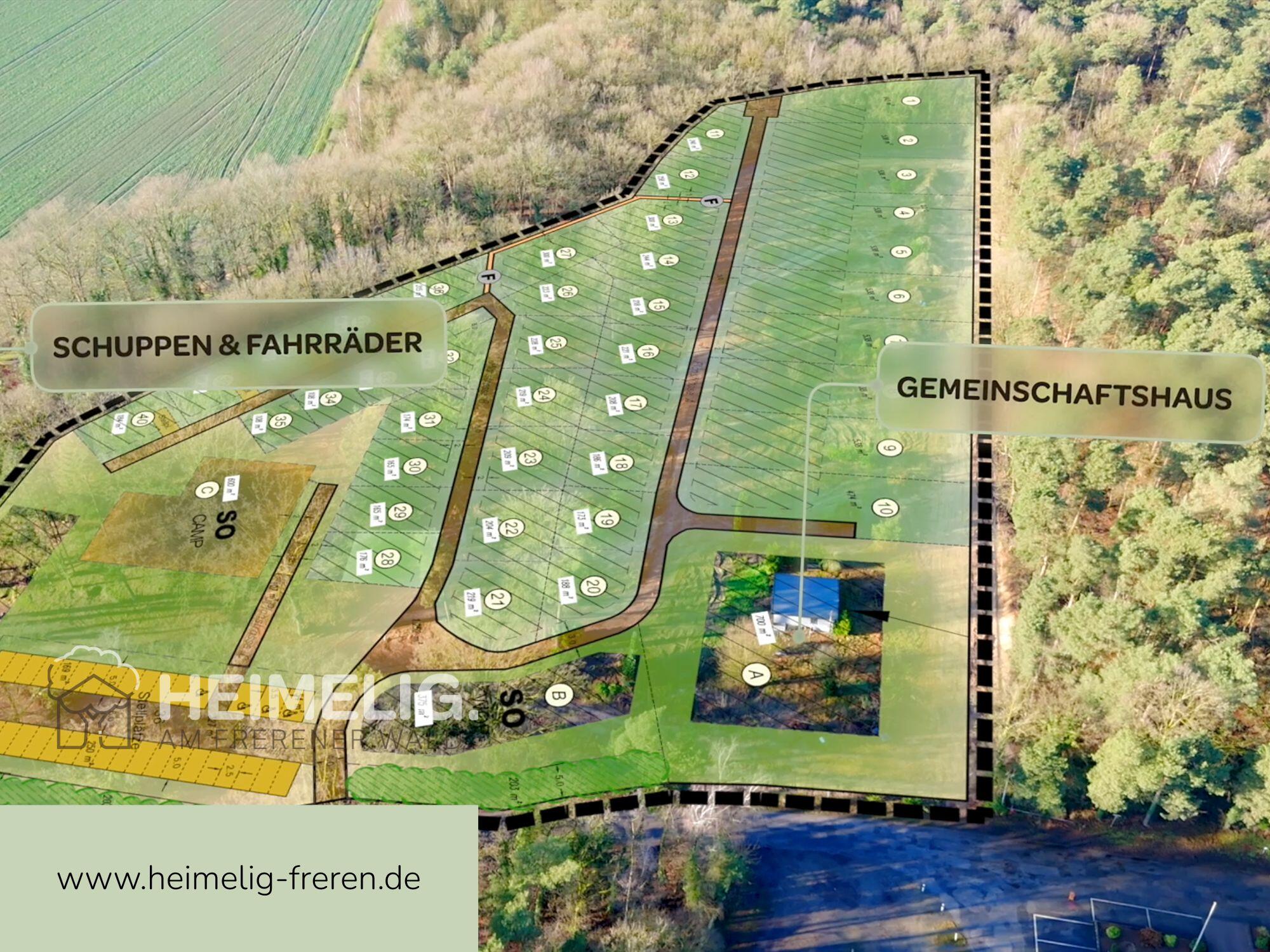 Das gesamte Areal umfasst rund 19.650 qm und ist nach dem Bebauungsplan Nr. 14 „An den Hünensteinen“, 2. Änderung als Ferien- und Wochenendgebiet ausgewiesen.Die Bebauung ist gemäß Bebauungsplan auf ein Kompakthaus mit einer maximalen Grund- und Geschossfläche von jeweils 40 qm begrenzt.