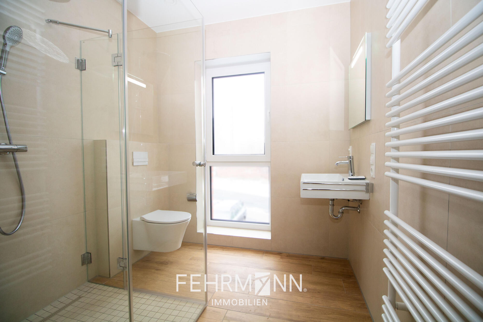 Moderne Sanitärinstallationen: Die Badezimmer sind mit stilvollen Sanitäreinrichtungen ausgestattet, darunter Duschbereiche und hochwertige Waschtischanlagen. Hier wurden ausschließlich namhafte Hersteller ausgewählt.