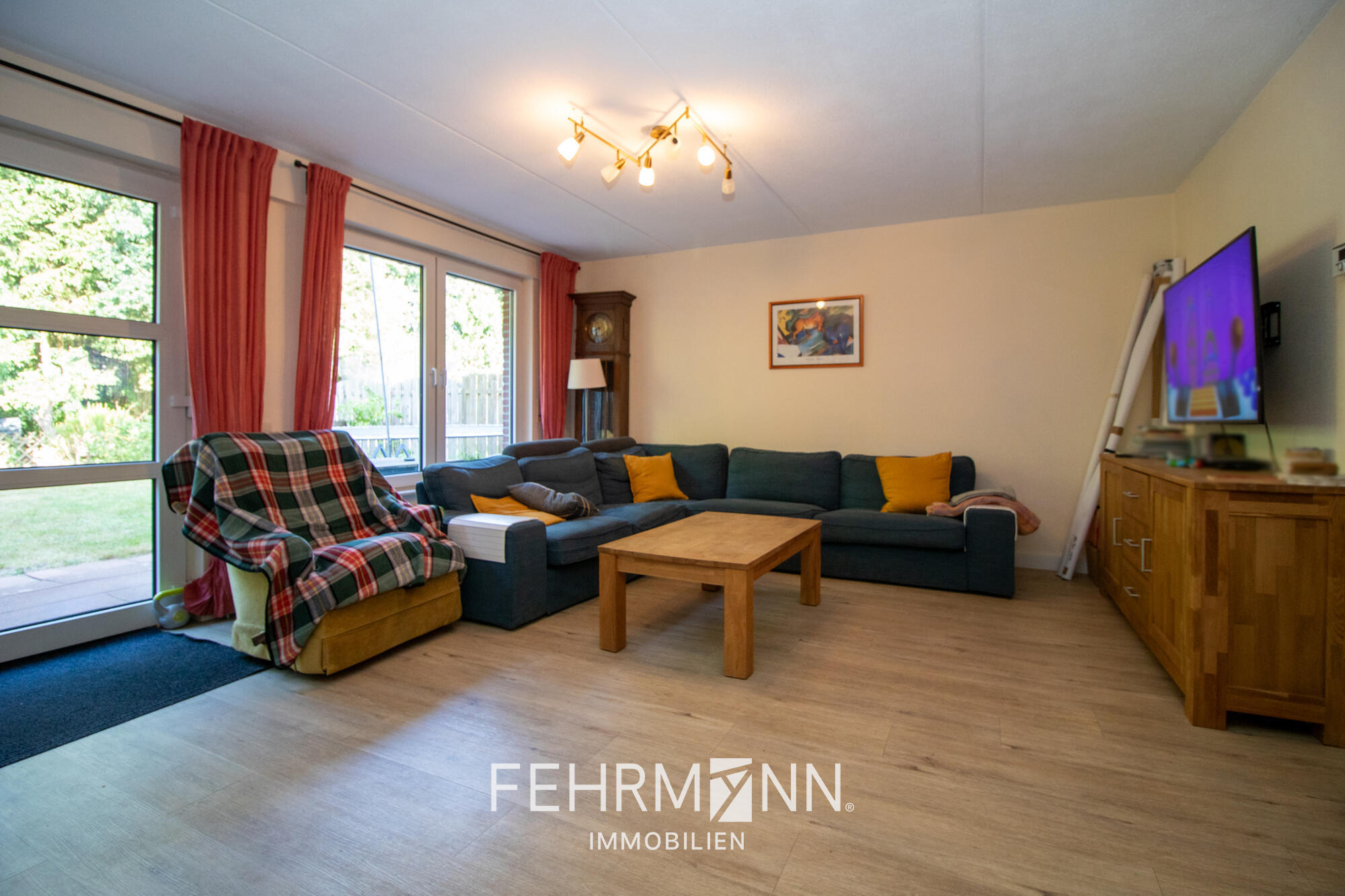 Das großzügige Wohnzimmer bietet mit seinem direkten Ausgang zum Garten einen wunderbaren Rückzugsort und viel Tageslicht. Von der Diele aus gelangen Sie sowohl zum Gäste-WC als auch zur Küche, welche mit einer modernen Einbauküche ausgestattet ist – diese ist bereits im Kaufpreis enthalten.