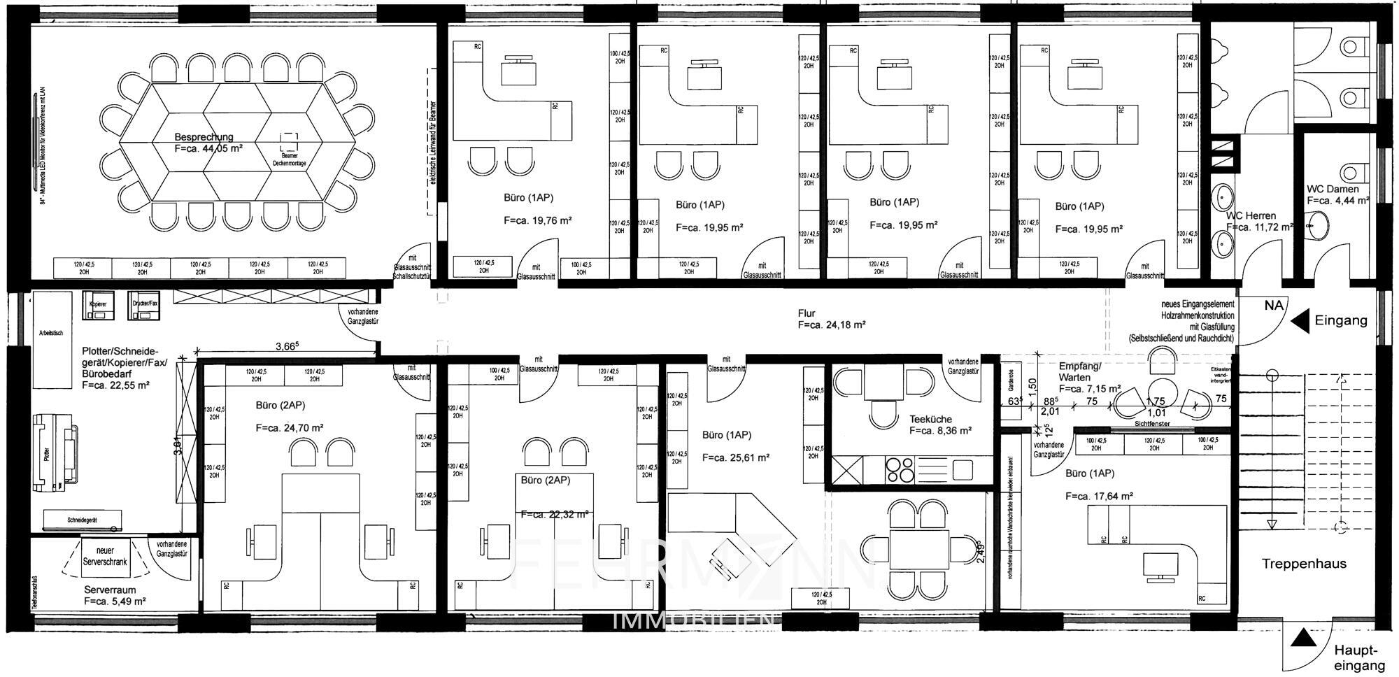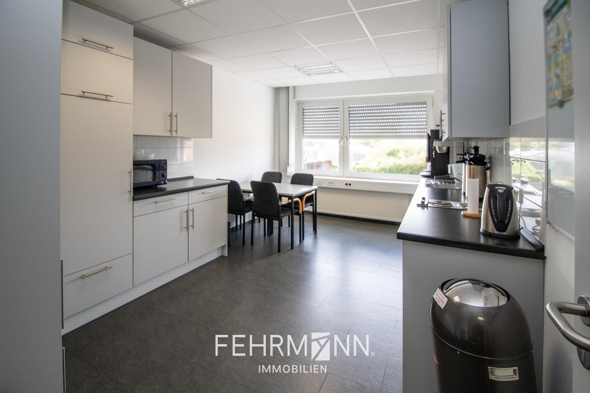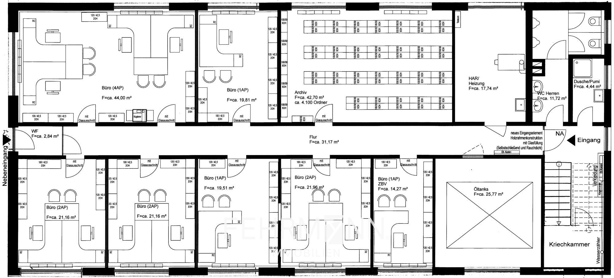Das Erdgeschoss umfasst etwa 300 Quadratmeter mit acht Büroräumen, einem Besprechungszimmer sowie einer Teeküche. Im Obergeschoss stehen weitere zehn Büros, ein Besprechungszimmer und eine zweite Teeküche auf ebenfalls circa 300 Quadratmetern zur Verfügung.