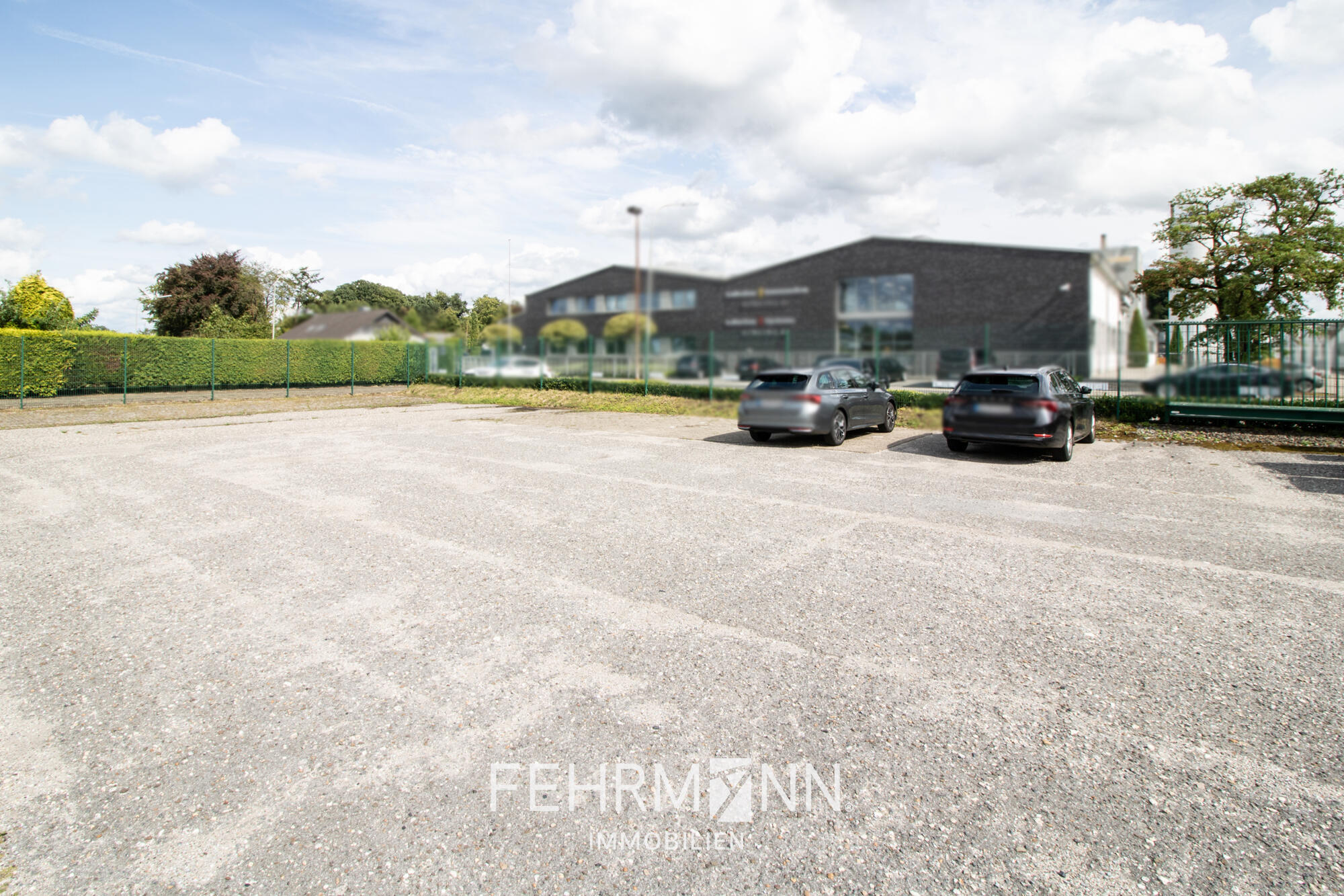 Das Gebäude ist von einem Stabgitterzaun mit Schiebetor umgeben und bietet ausreichend befestigte Parkplätze direkt auf dem Gelände. Zusätzlich verfügt das Grundstück über großzügige Freiflächen von etwa 4.200 Quadratmetern, die vielfältige Nutzungsmöglichkeiten eröffnen – sei es für Erweiterungen, Außenanlagen oder andere betriebliche Zwecke.