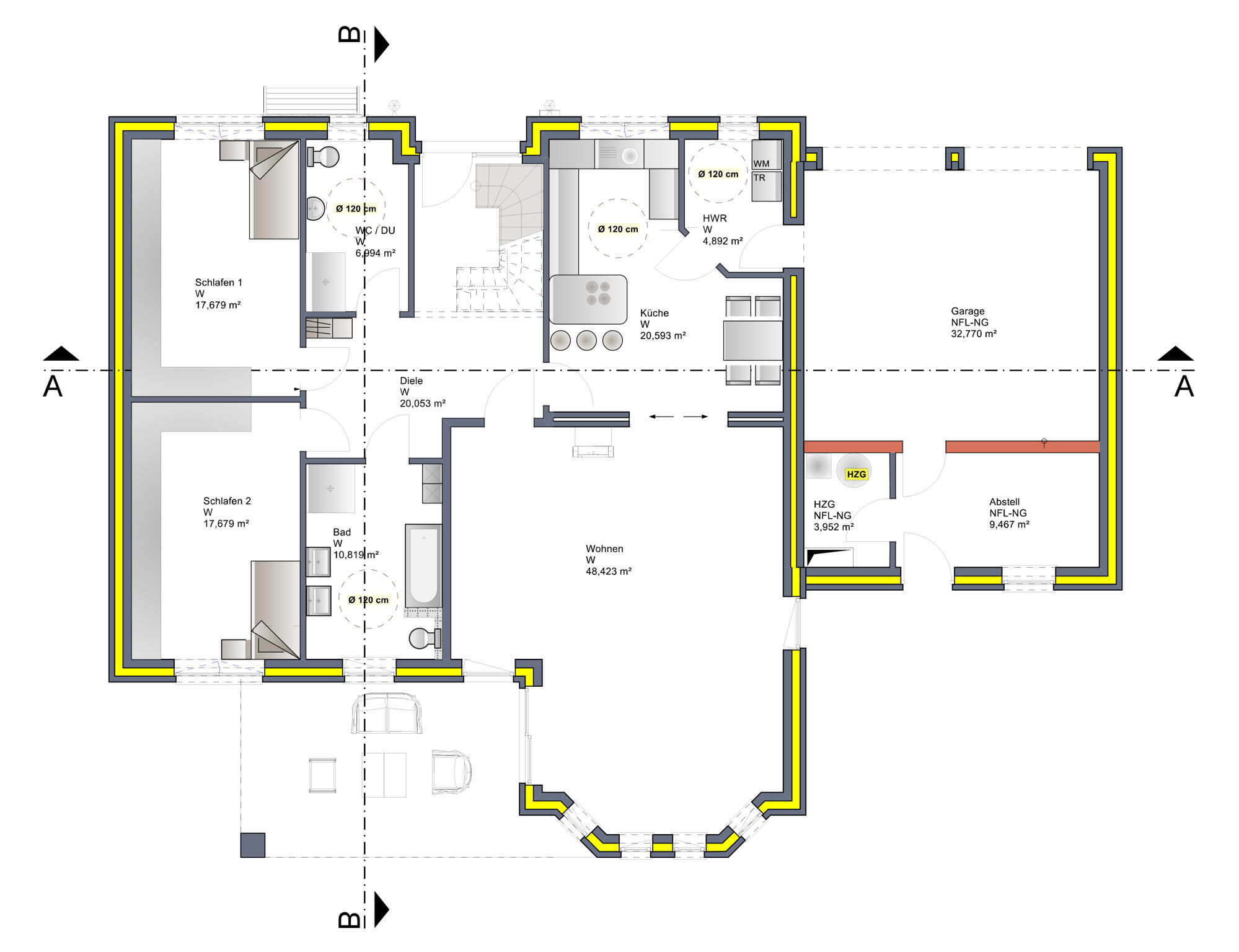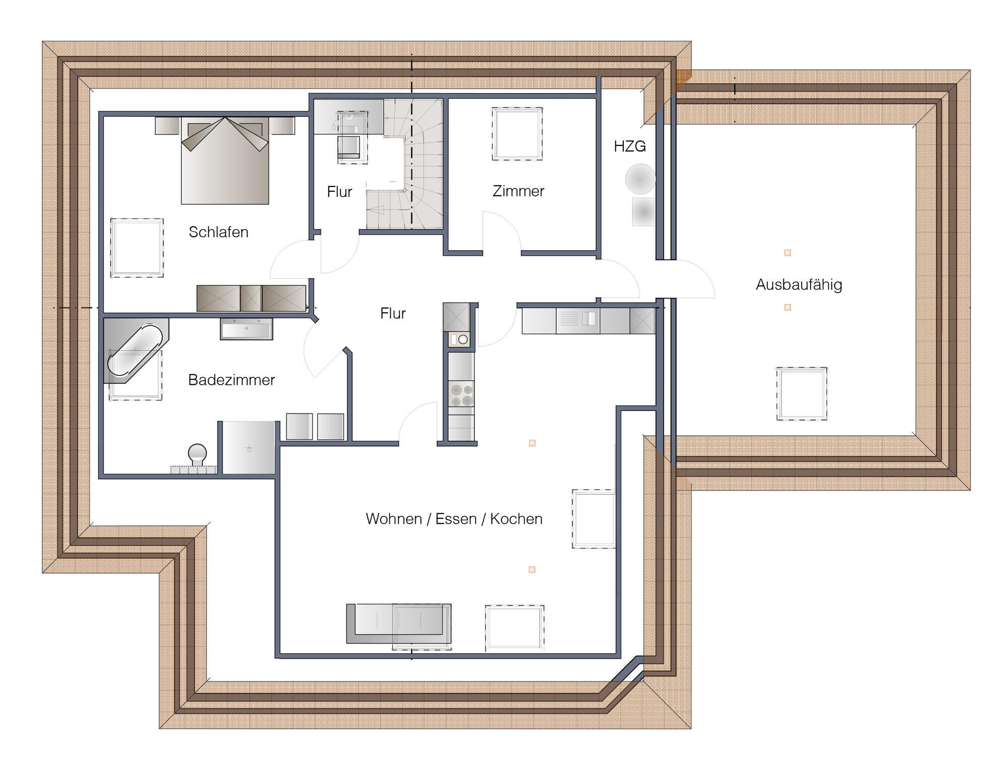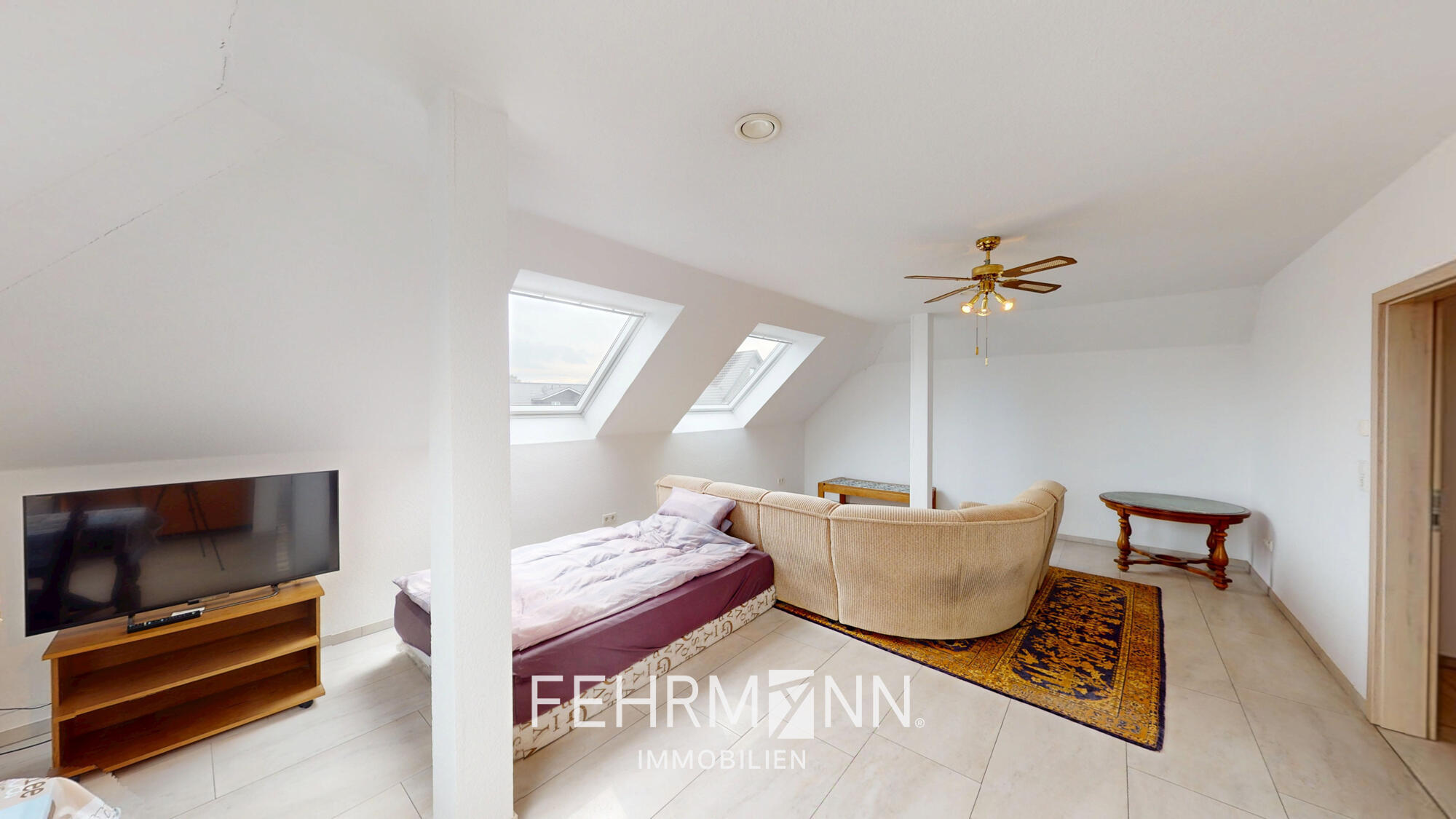 Ergänzend stehen ein separater Heizungsraum sowie eine großzügige Abstellfläche über der Garage zur Verfügung, die bei Bedarf auch zu Wohnzwecken ausgebaut werden kann.