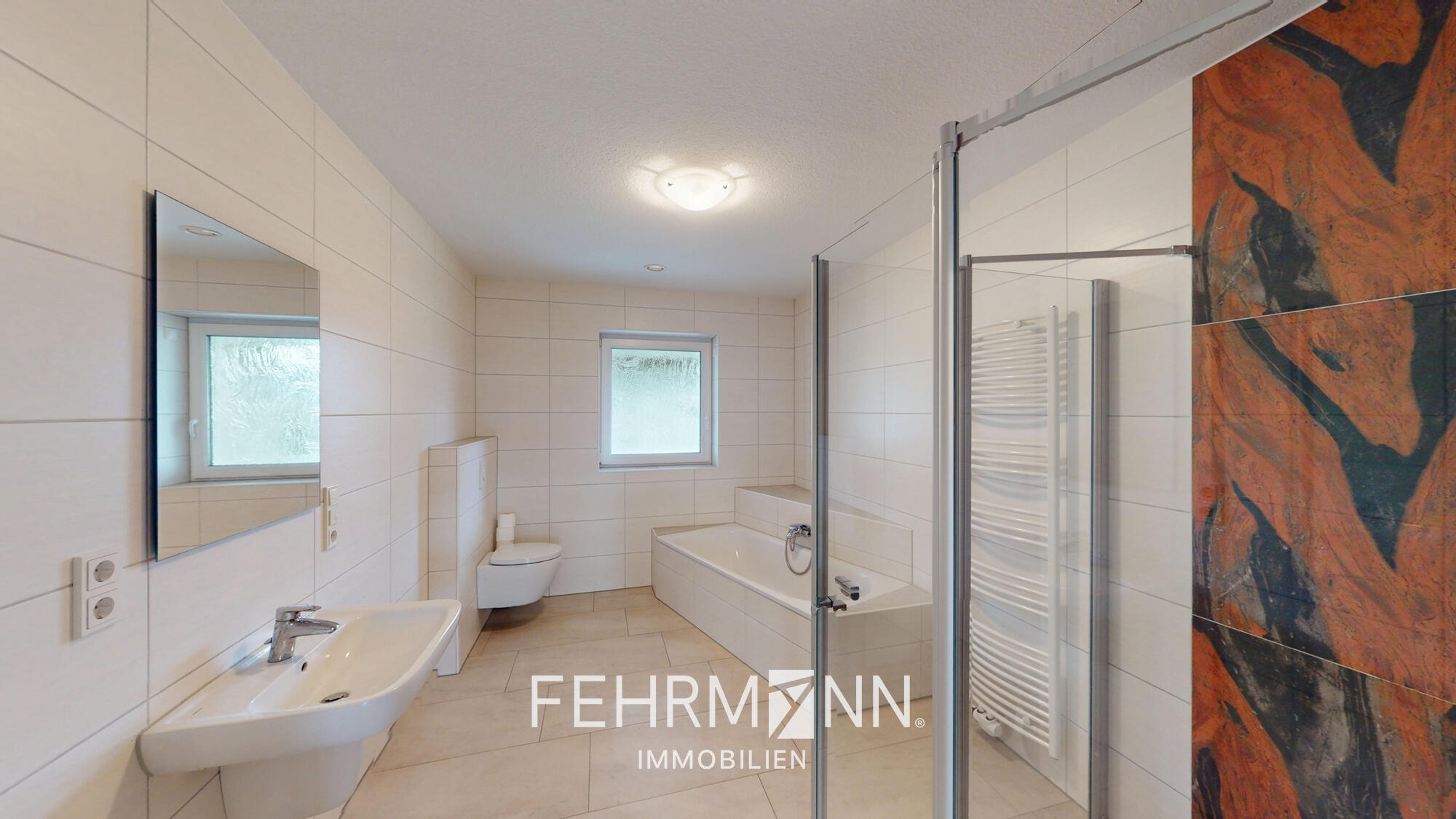 Alle Badezimmer sind raumhoch gefliest, verfügen über ein Fenster und sind mit Badewannen ausgestattet. Die Duschen sind mit hochwertigen Fliesen versehen und bieten ein modernes, ansprechendes Design.