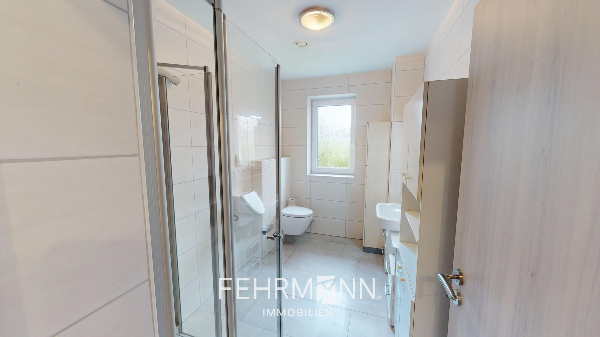 Auch das Gäste-WC verfügt über ein Fenster, raumhohe Fliesen und einer separaten Dusche.