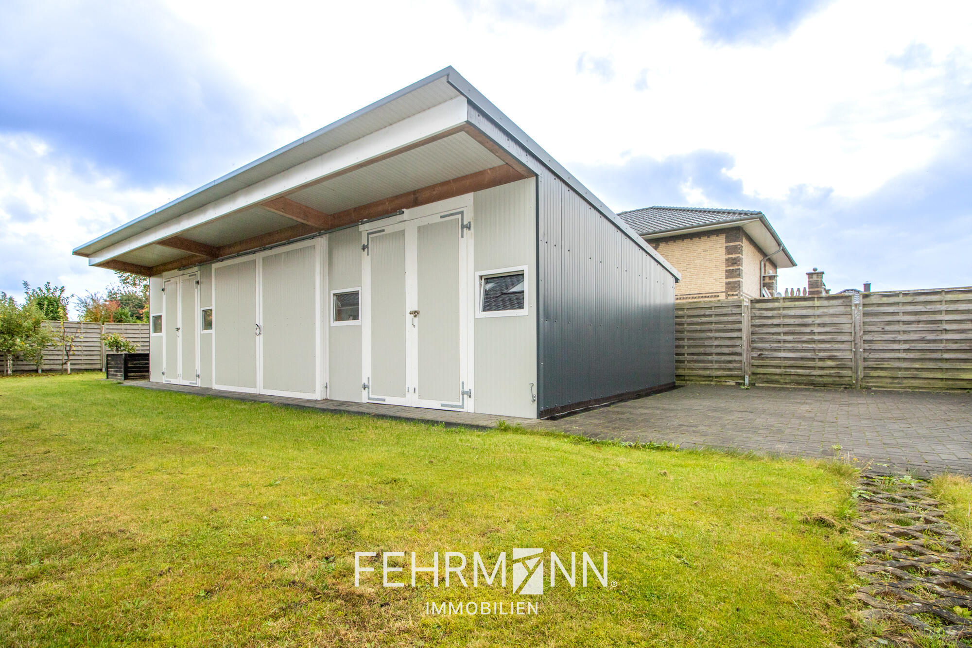 Die Garage ist mit Sektionaltoren ausgestattet und bieten bequemen Zugang. Davor befinden sich weitere Stellflächen, sodass insgesamt bis zu vier Fahrzeuge Platz finden.