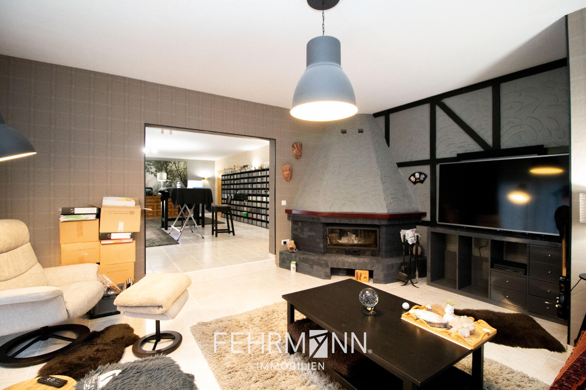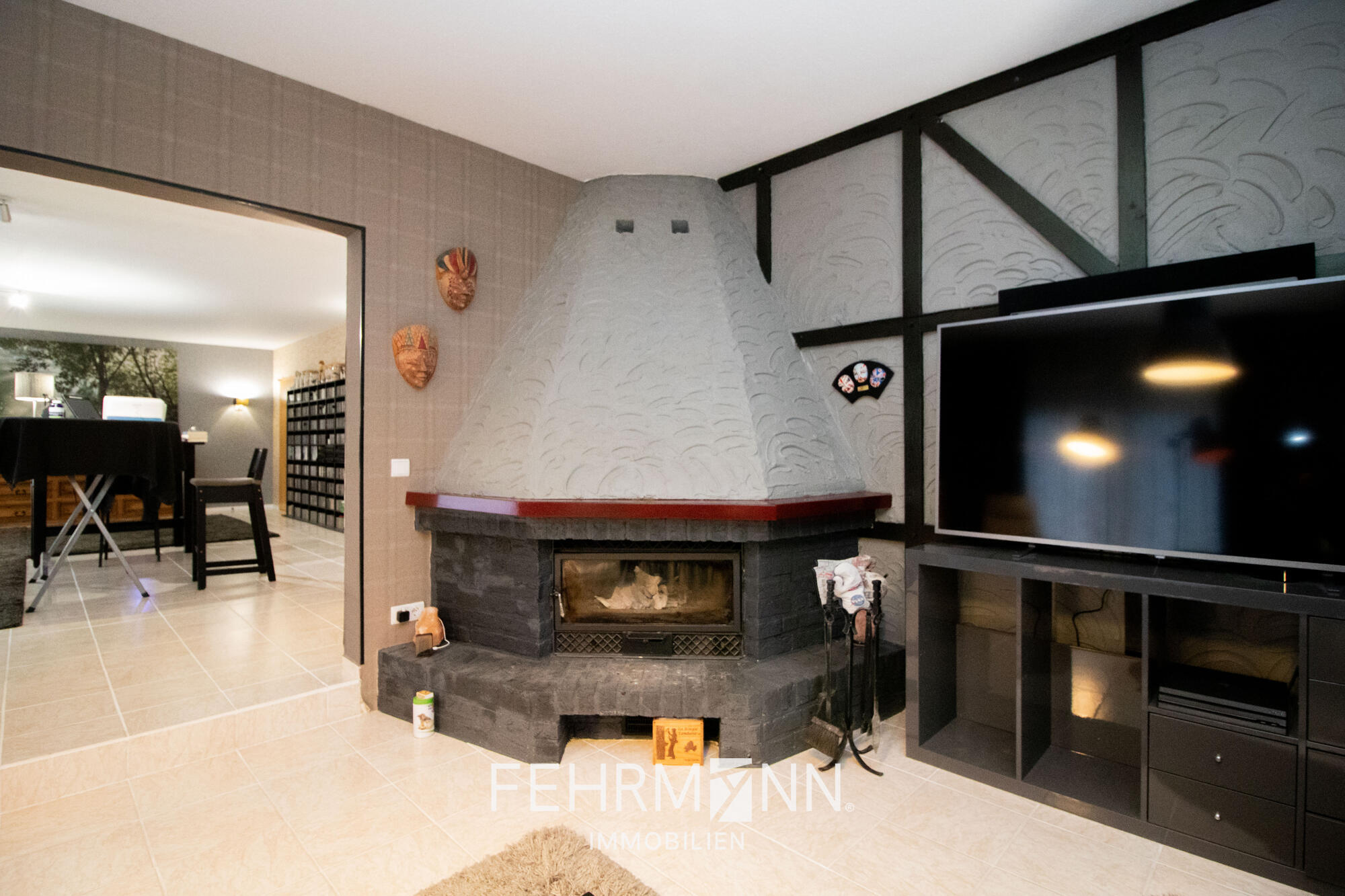 Ein besonderes Highlight ist das abgesenkte Kaminzimmer mit Erker, das Gemütlichkeit und Stil vereint.