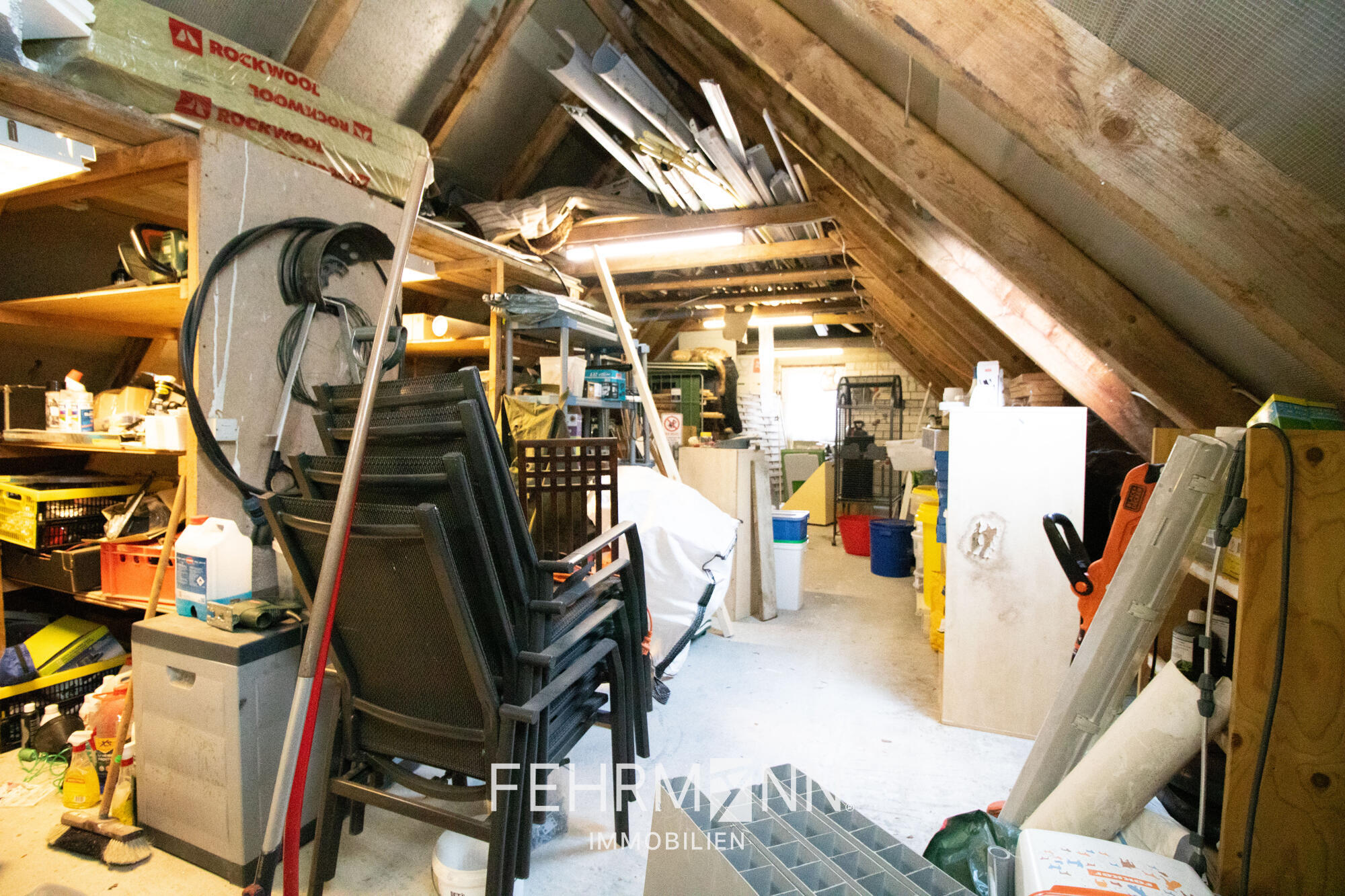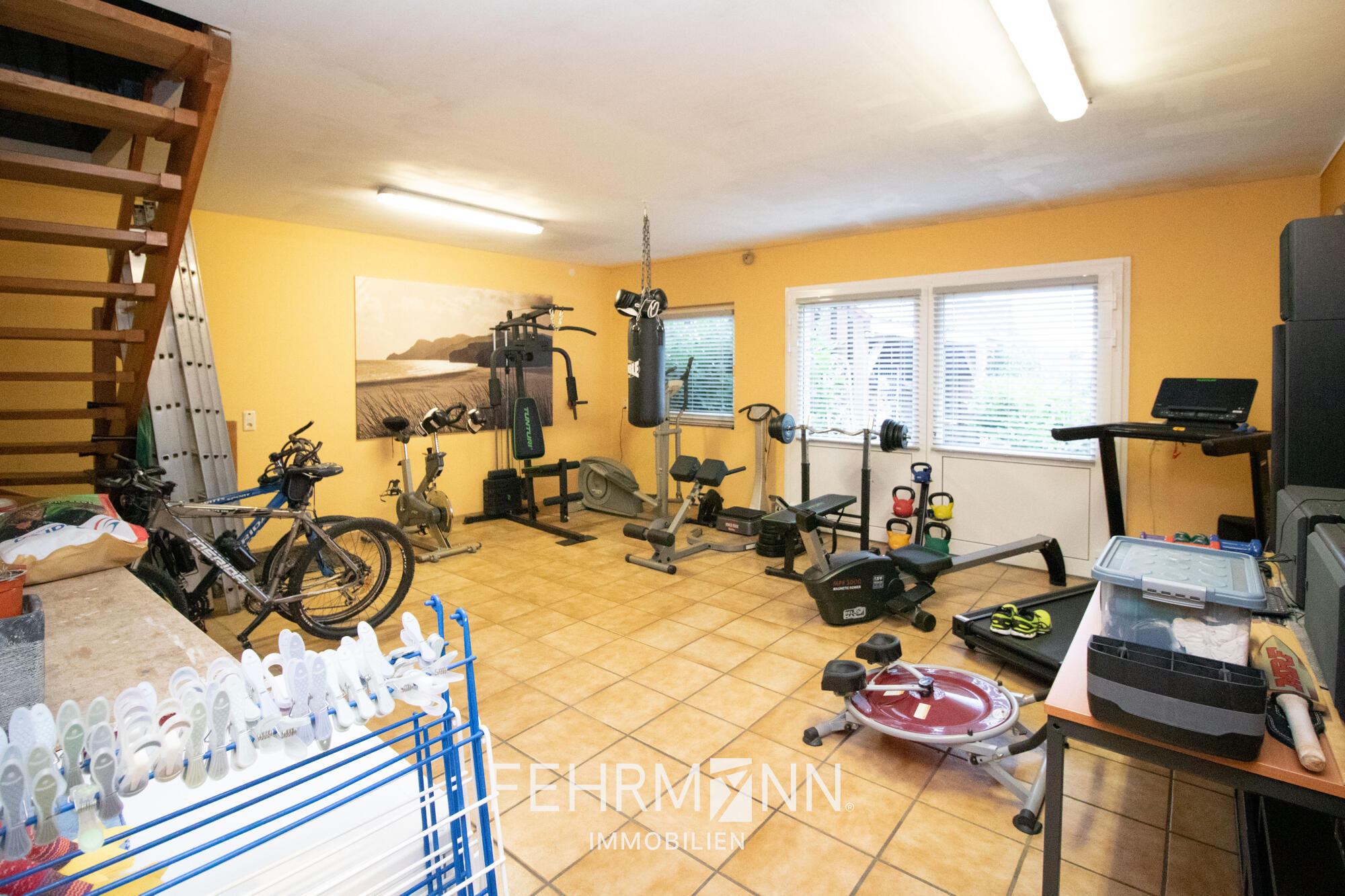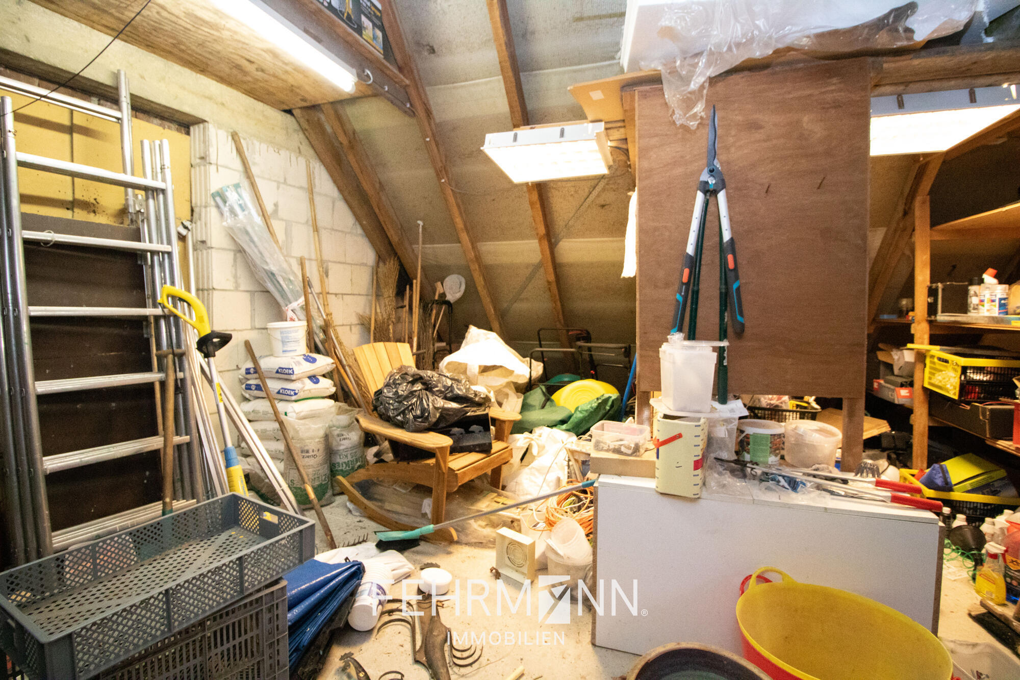 Die großzügige, geflieste Doppelgarage bietet nicht nur Platz für zwei Fahrzeuge, sondern auch einen großen Fitnessraum direkt dahinter – ideal für sportliche Aktivitäten zu Hause. Oberhalb der Garage steht ein großer Stauraum zur Verfügung.