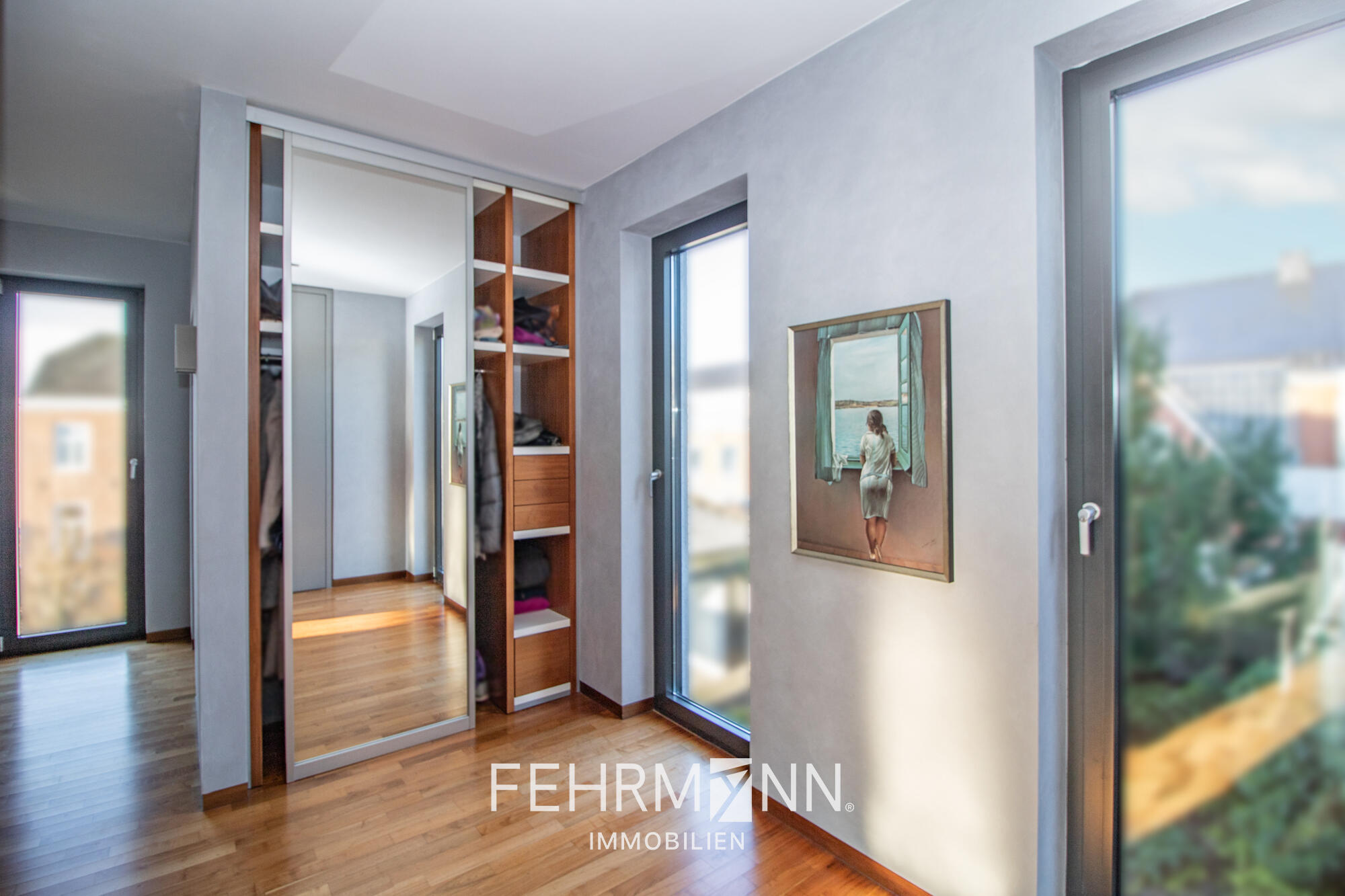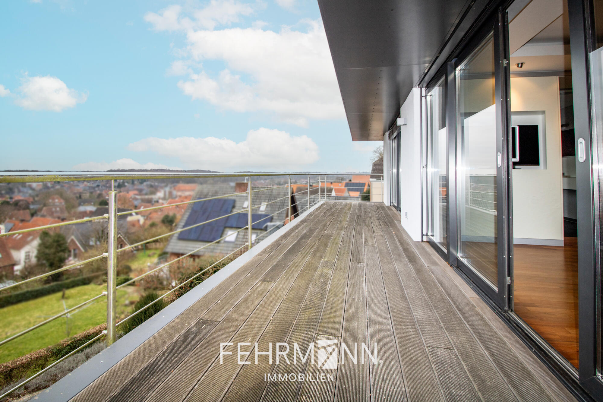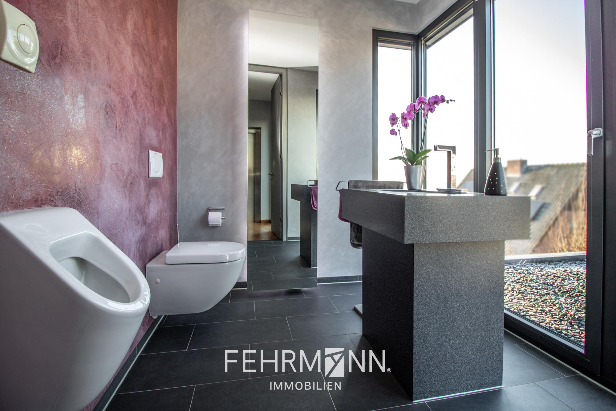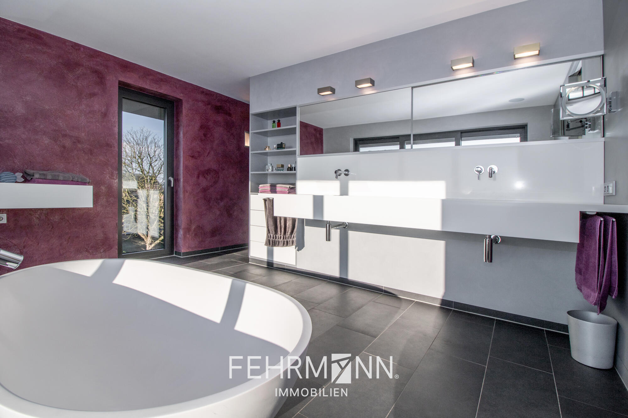 Das großzügige Badezimmer ist mit einer freistehenden Design-Badewanne ausgestattet, die den traumhaften Blick aufs Münsterland freigibt. Zudem finden Sie hier eine große begehbare Dusche, zwei Waschtische sowie moderne Badmöbel.