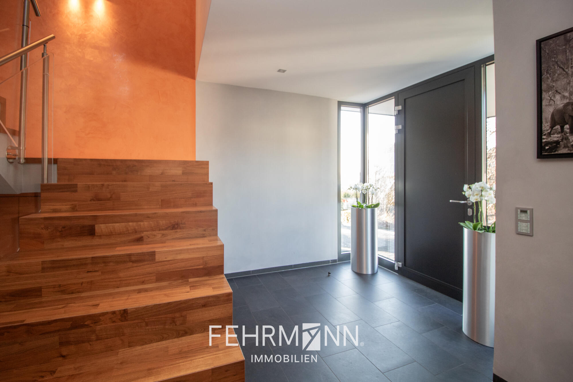 Im Obergeschoss erwarten Sie auf rd. 134 m2 ein großes, helles Wohn- und Esszimmer mit Zugang zur 40 m2 großen Balkonterrasse in Südlage, die einen atemberaubenden Ausblick ins Umland bietet.