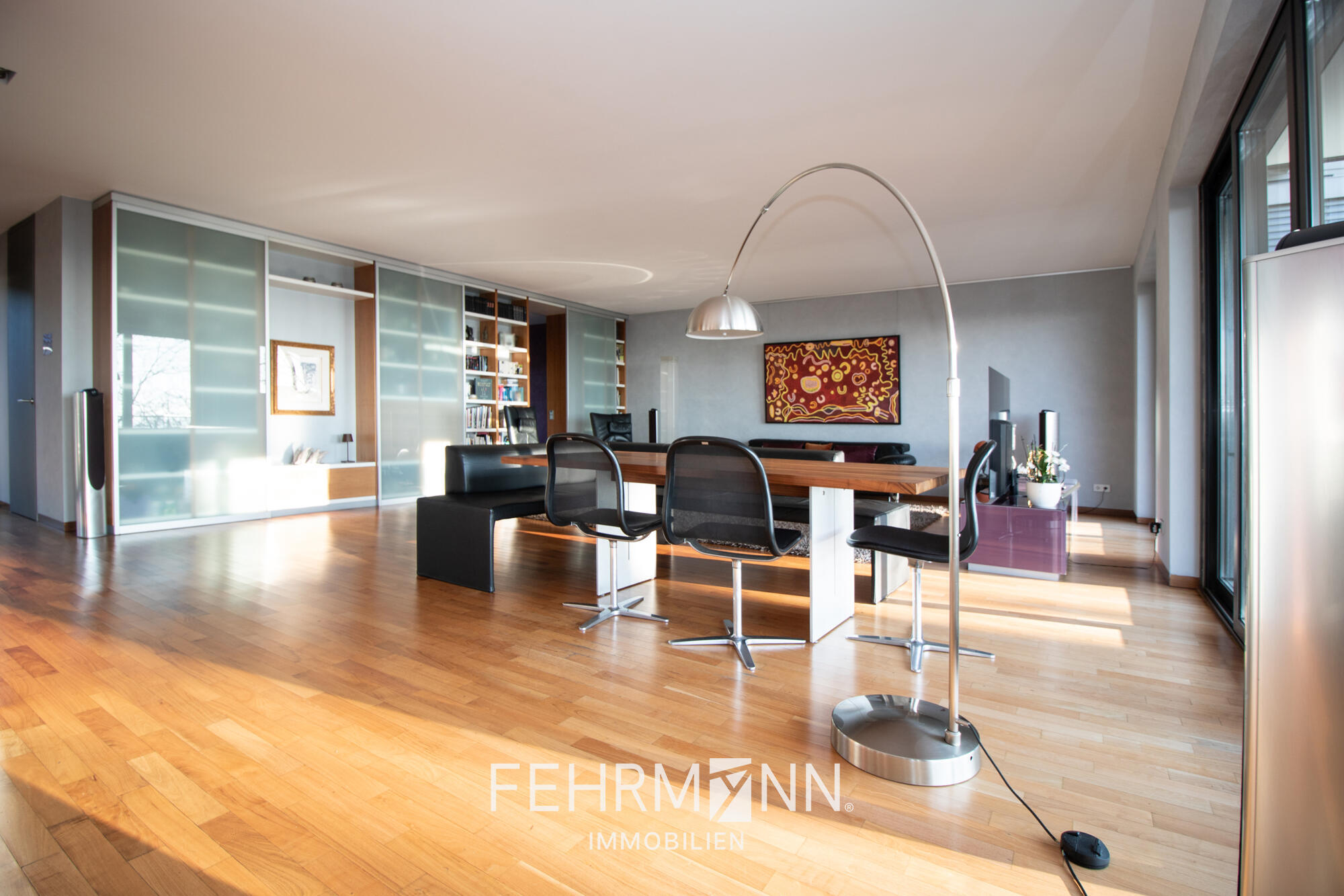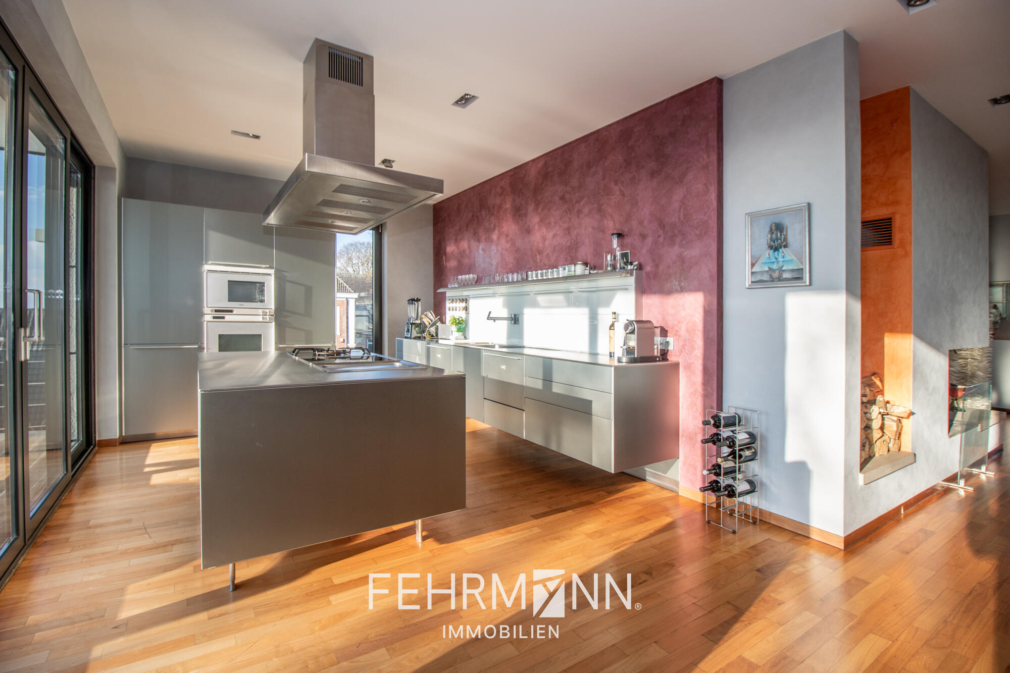 Die moderne und hochwertige Bulthaup-Küche fügt sich harmonisch in den offenen Wohnbereich ein. Nussbaum-Echtholzböden, eine Deckenhöhe von 2,70 m sowie bodentiefe Fenster schaffen eine angenehme Atmosphäre.