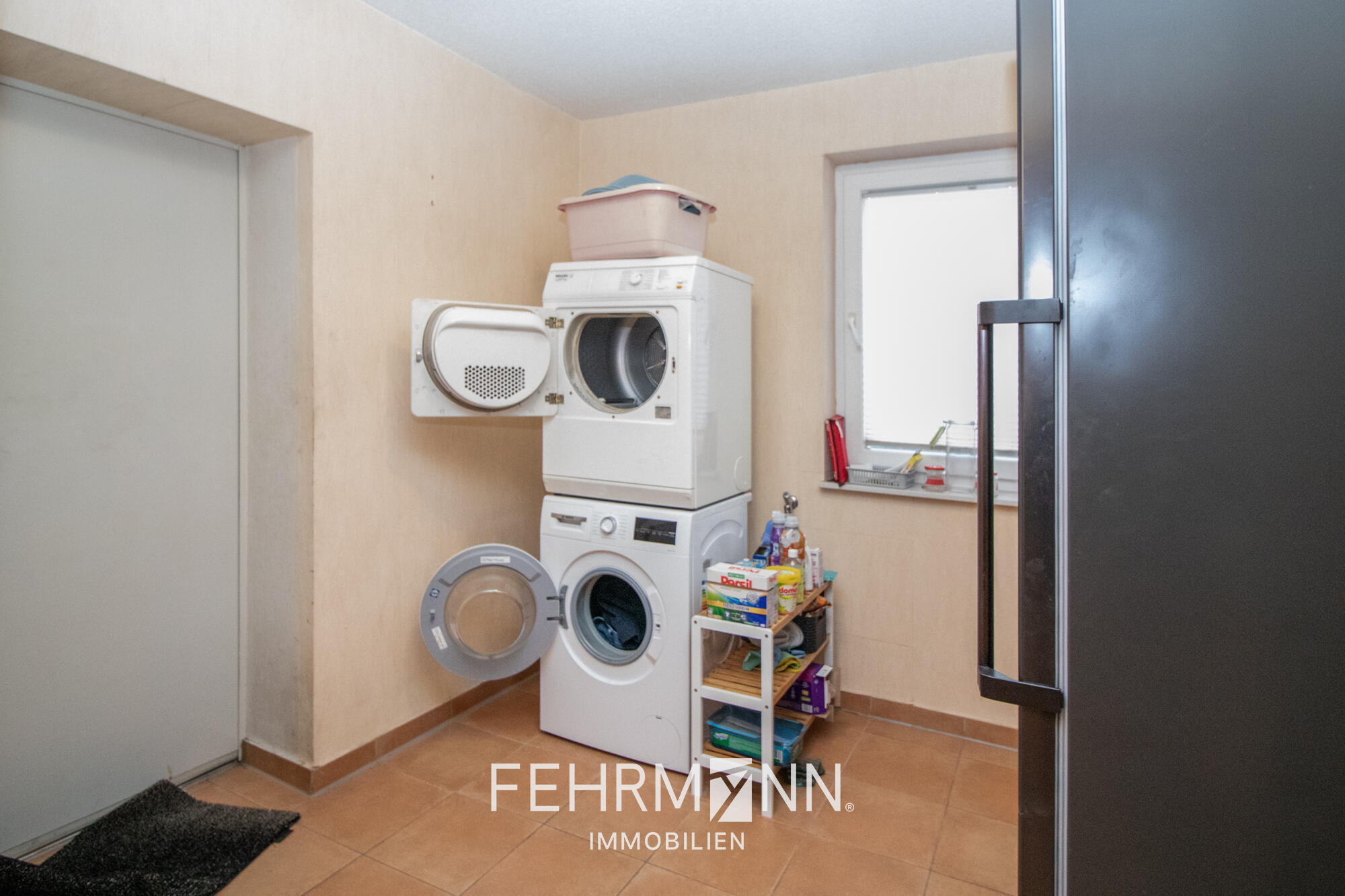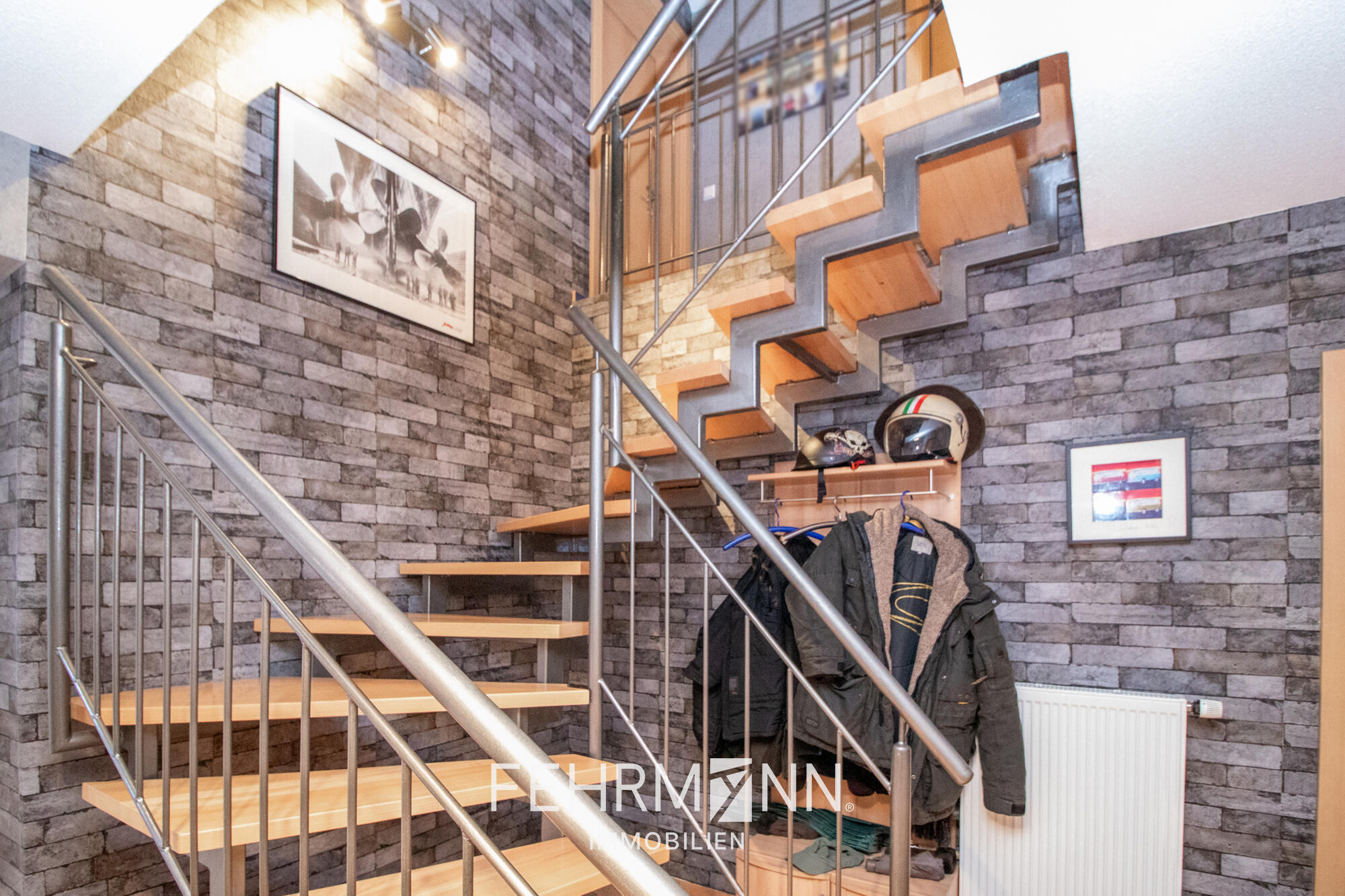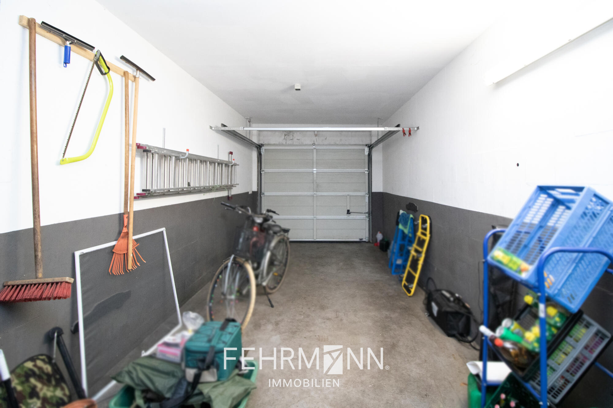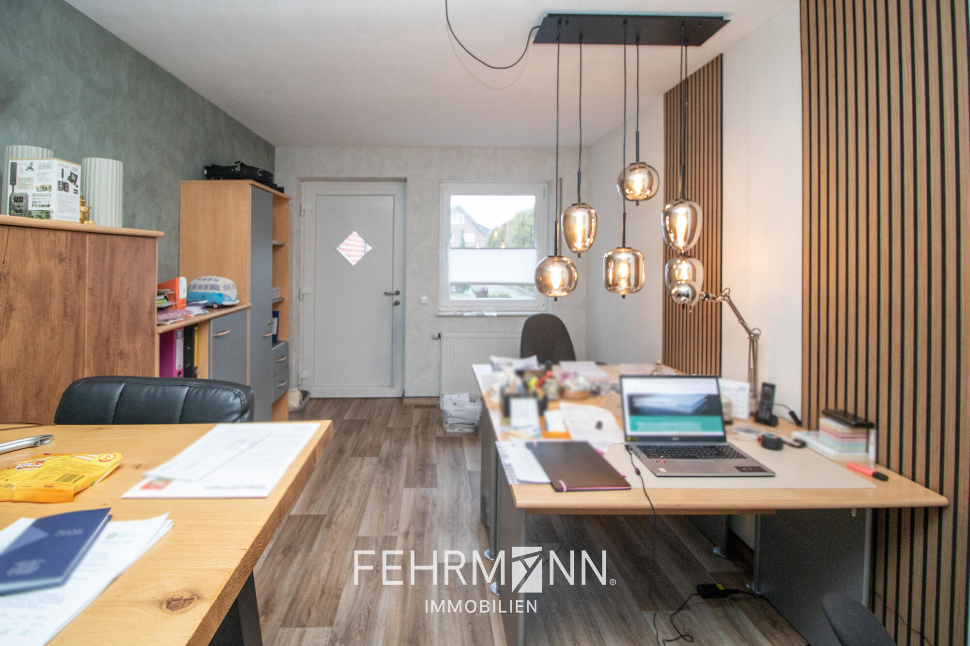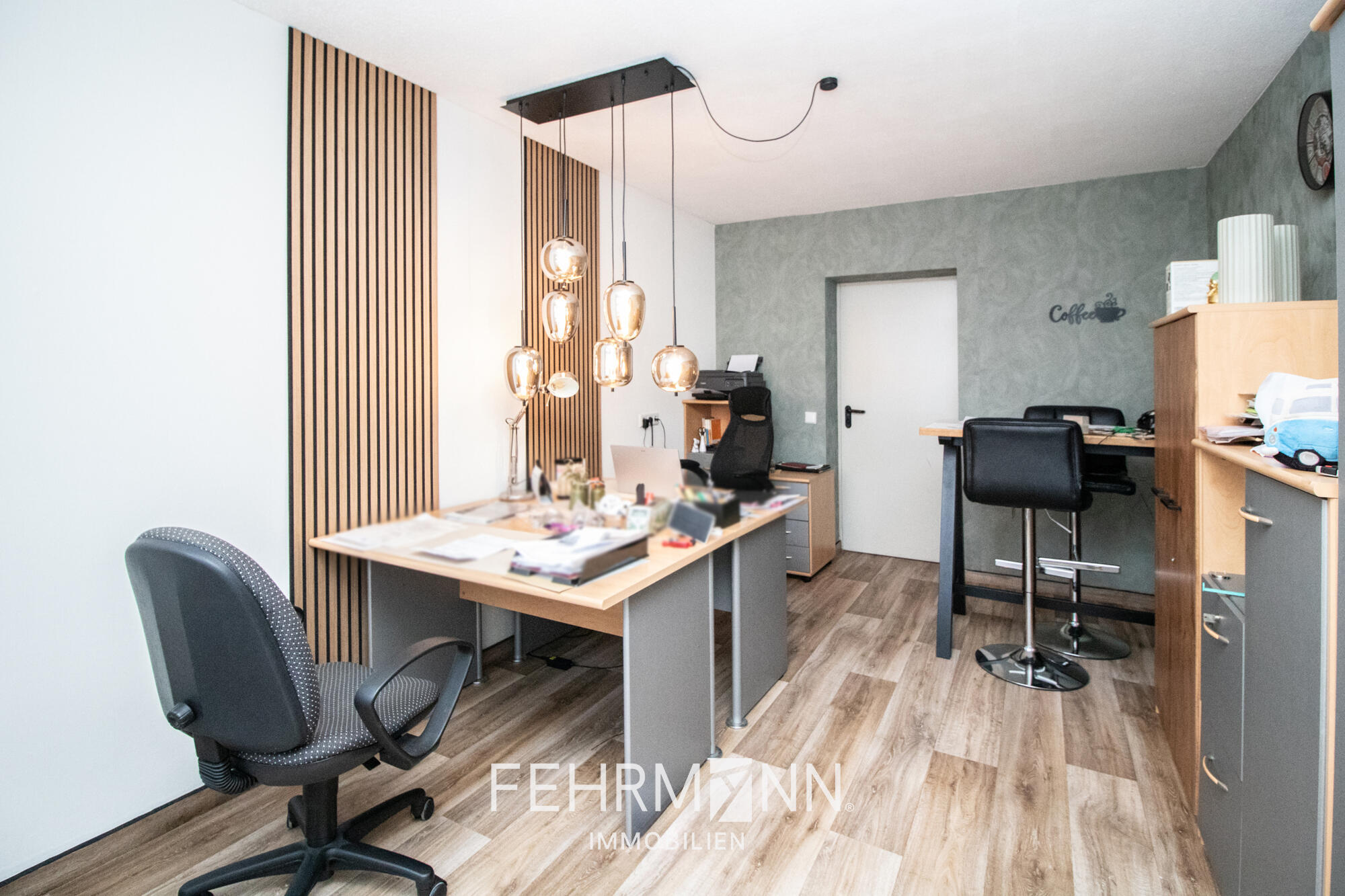 Praktisch angeordnet sind im Erdgeschoss zudem ein Gäste-WC sowie ein Büroraum, der sich ideal für das Arbeiten von zu Hause eignet. Die angrenzende Garage verfügt über einen großen Geräteraum und bietet zusätzlichen Stauraum. Für weitere Fahrzeuge steht ein zusätzlicher Stellplatz zur Verfügung, an dem auch eine Wallbox installiert ist – perfekt für Elektrofahrzeuge.