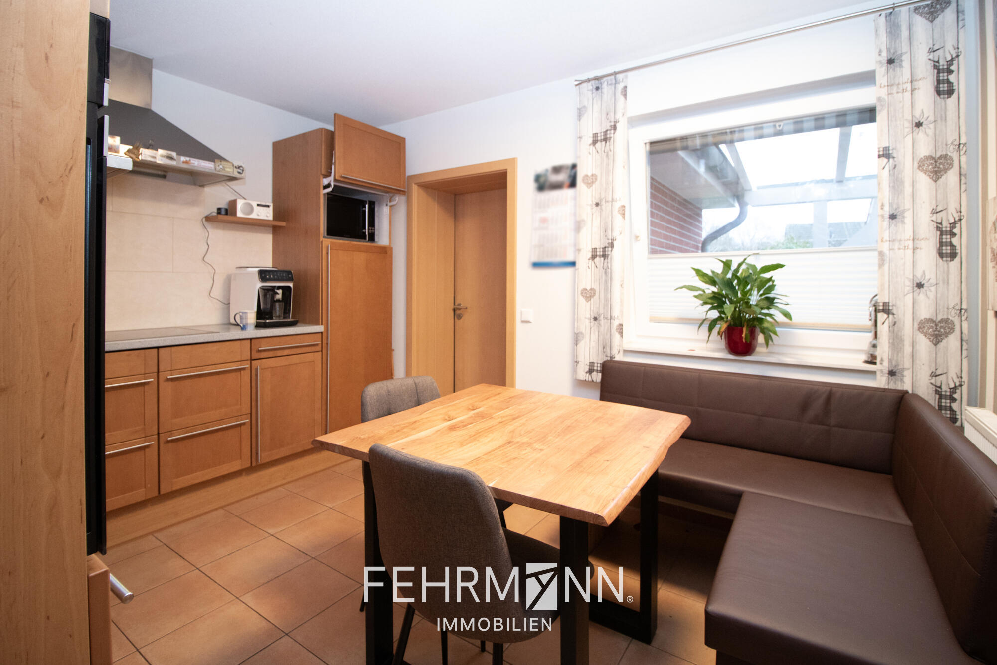 Die angrenzende Küche ist mit einer modernen Einbauküche ausgestattet, die im Kaufpreis enthalten ist, und über eine gemütliche Sitzecke verfügt. Von hier aus gelangen Sie direkt in den Garten, der mit Obstbäumen bepflanzt ist und eine überdachte Terrasse für entspannte Stunden im Freien bietet.