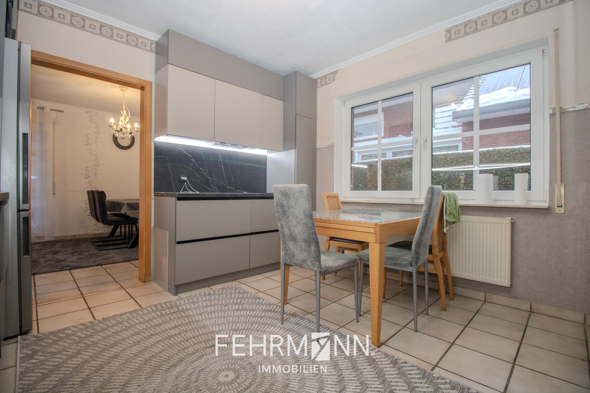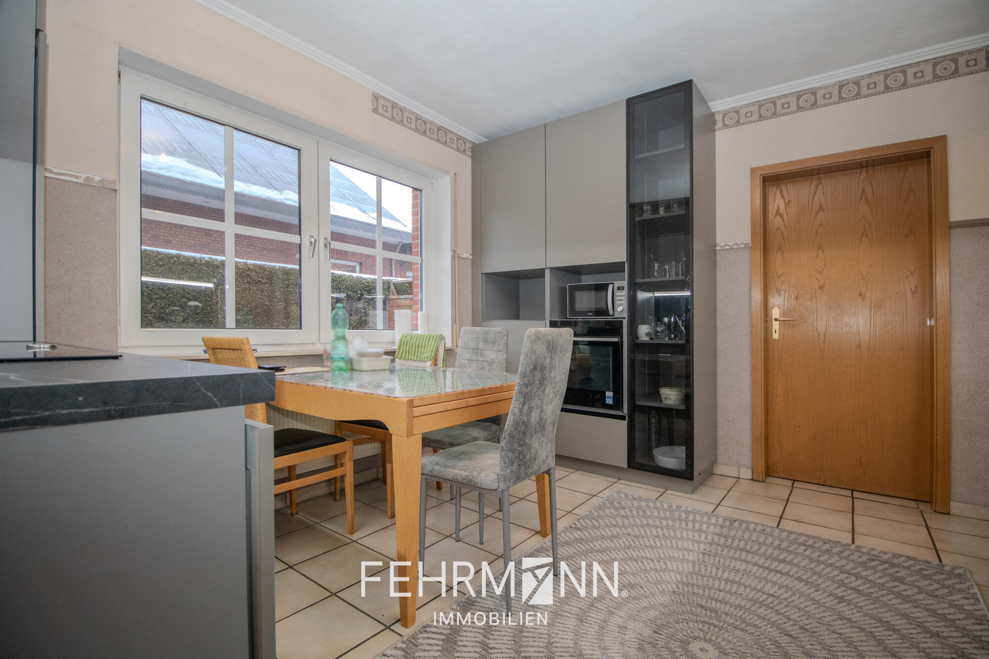Die funktionale Einbauküche mit praktischen Einbauschränken ist im Kaufpreis enthalten. Ein angrenzender Hauswirtschaftsraum bietet zusätzlichen Stauraum für Haushaltsgeräte und Vorräte. Anschlüsse für Waschmaschine und Trockner sind ebenfalls vorhanden.
