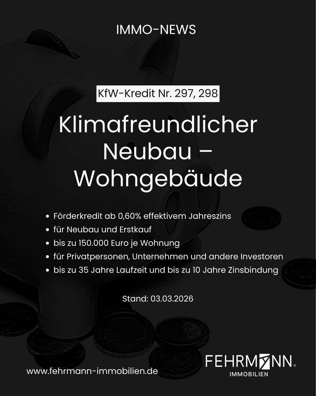 KfW-Förderkredit ist so günstig wie seit langem nicht mehr – aktuell (Stand 05.03.2026) ab 0,60% effektivem Jahreszins für Haus und Wohnung, die energieeffizient und nachhaltig gebaut werden.